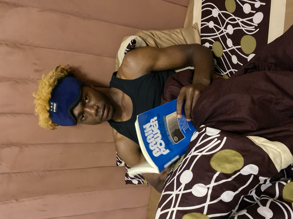 A young male individual, with dark skin and light brown curly hair, is seated upright in a bed in Igboefon, Nigeria. He wears a black tank top and a dark blue sleep mask, bearing the text "Ki-dudu" and a symbol resembling a Bluetooth icon, pushed up onto his forehead. A nose piercing is visible on his left nostril. He holds an open blue book titled "BRAIN POWER," featuring an image of a floppy disk on its cover, in his left hand. His gaze is directed towards the camera with a neutral expression. The background consists of a light brown vertically paneled headboard or wall. He is partially covered by a dark brown duvet, while a pillow with a brown and white circular geometric pattern is visible to his left.