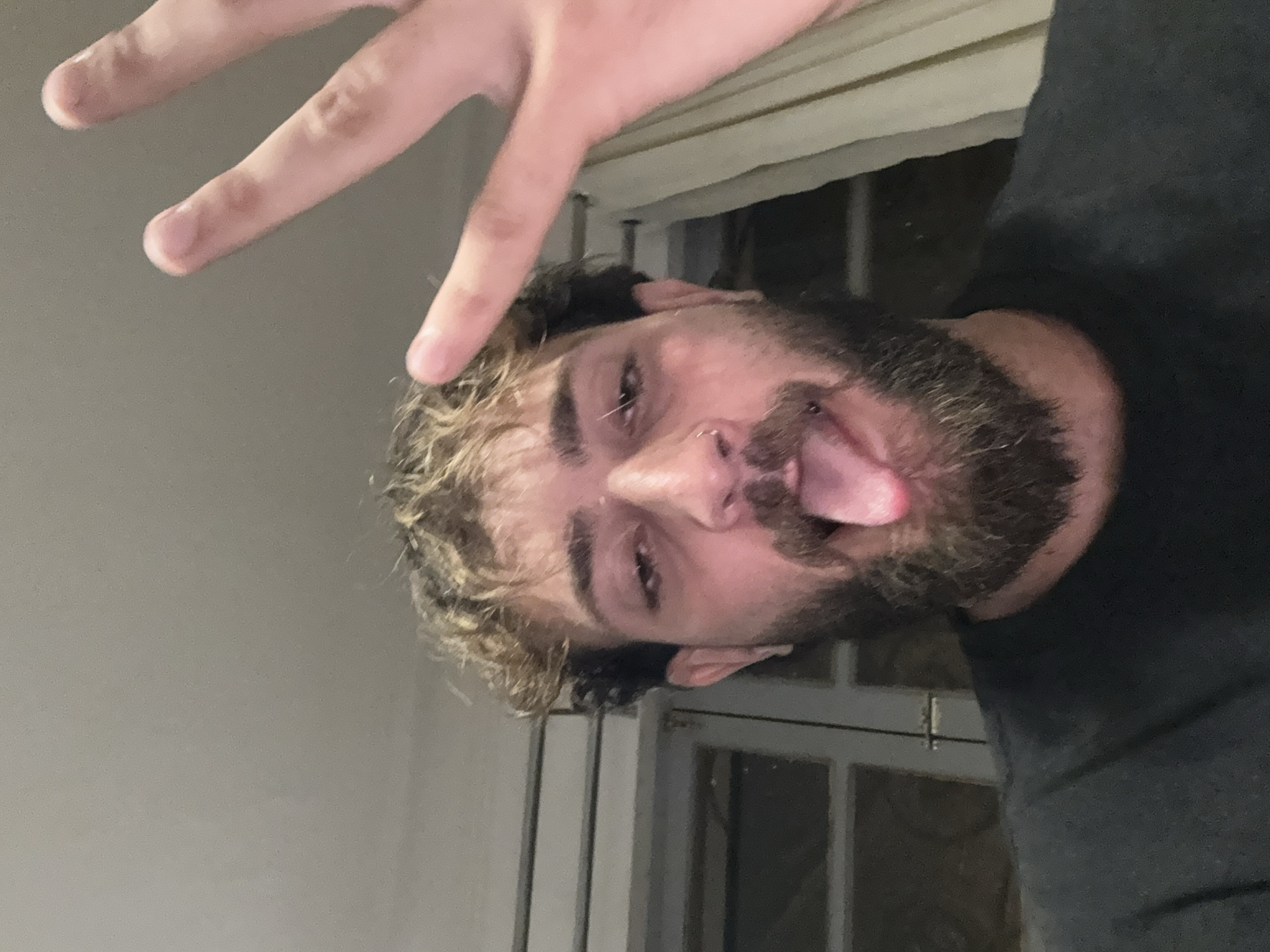 The image displays a close-up, chest-up view of a male individual located indoors in the city of Cuzco, Peru. The subject has wavy, light brown hair and a dark brown beard. He wears a dark-colored t-shirt. Visible facial piercings include a silver-colored ring in the left nostril and a silver-colored barbell piercing on the lower lip. The individual's mouth is open, with his tongue extended downwards and outwards. His right hand is raised, with the index and middle fingers forming a 'V' shape. The background features a partial view of a white-framed window on the left and a light-colored curtain on the right. A plain, light-colored ceiling is visible above the subject. The scene is illuminated by artificial lighting.