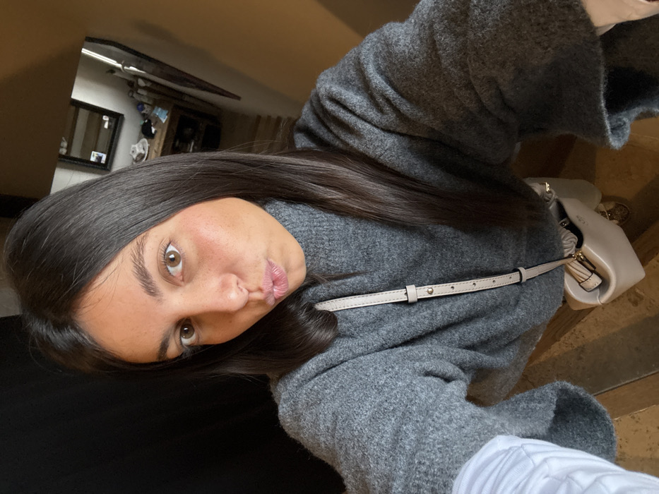 A female subject is depicted taking a selfie indoors in Antibes, France. She has long, dark brown hair parted centrally and light brown eyes. Her facial expression includes pursed lips, forming a "kiss" gesture. She wears a grey, long-sleeved turtleneck sweater, with a white undershirt sleeve visible beneath the left cuff. A light-colored shoulder bag, with a visible strap across her chest, hangs to her right side. The immediate background to her left is dark. To her right, a reflection in a mirror reveals an interior space featuring a wooden console table, a framed mirror above it, and several small objects on the table, including a hat and various containers. The flooring visible beneath the subject is light brown, consistent with wood or tile. The scene is illuminated by ambient indoor light.