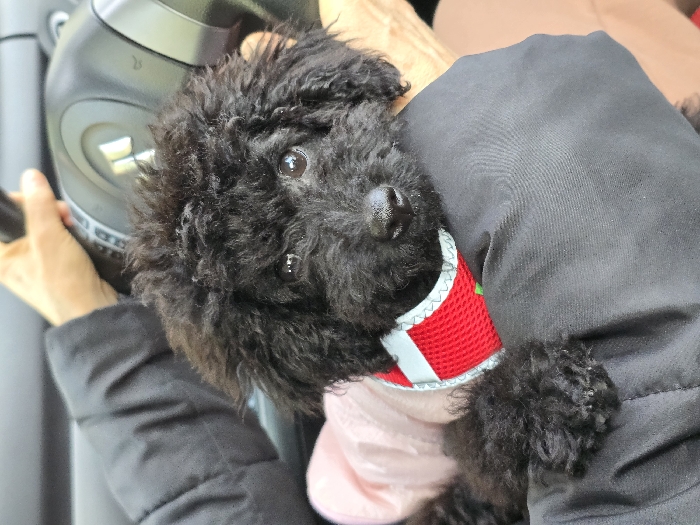 small, black, curly-haired dog, resembling a poodle, positioned inside a vehicle in Pleven, Bulgaria