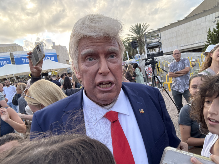 The image displays a man costumed as Donald Trump, centrally positioned amidst a dense crowd in Rabin Square, Tel Aviv, Israel