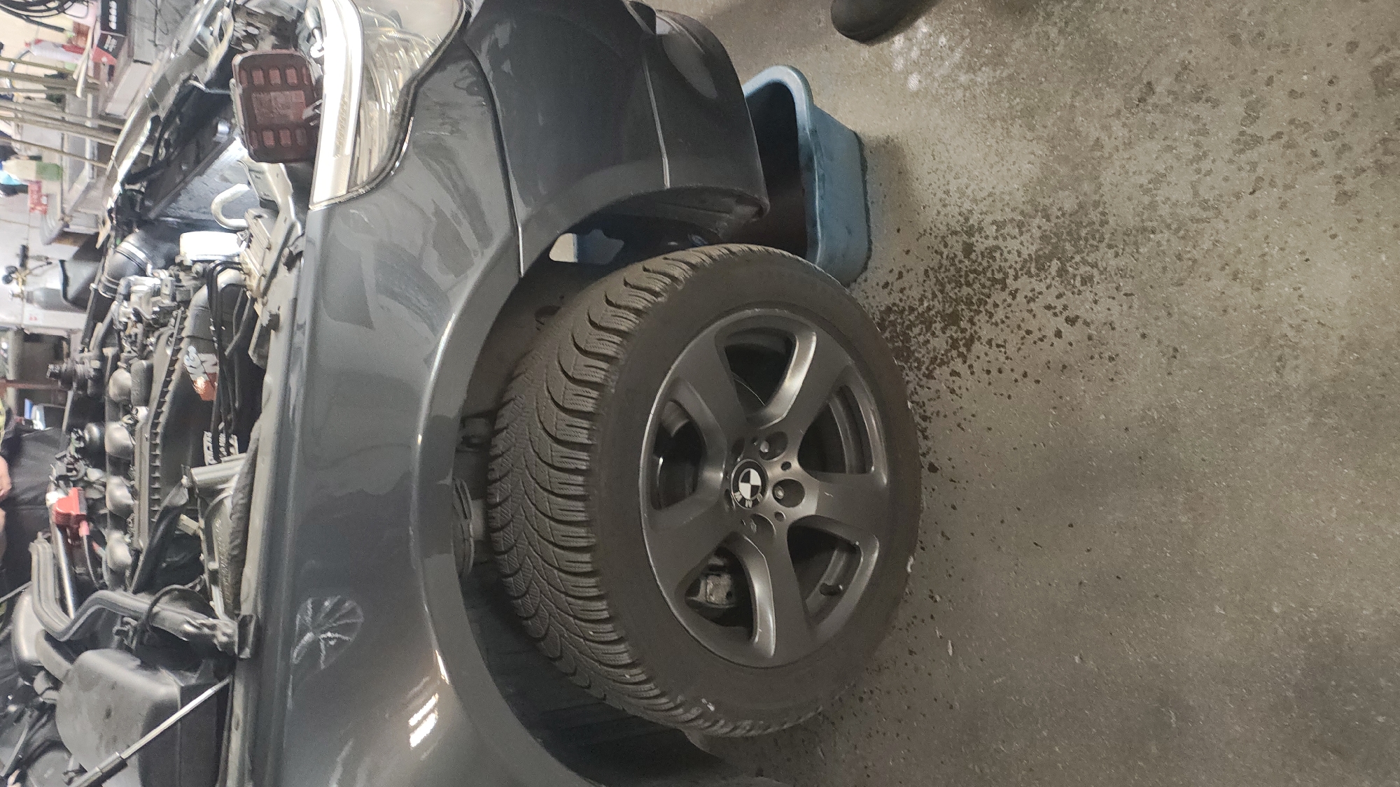 - "The image displays the front driver's side of a dark grey BMW vehicle, likely an E60 series, undergoing maintenance in an automotive repair facility" by FM-gSbe02, licensed under CC BY 4.0