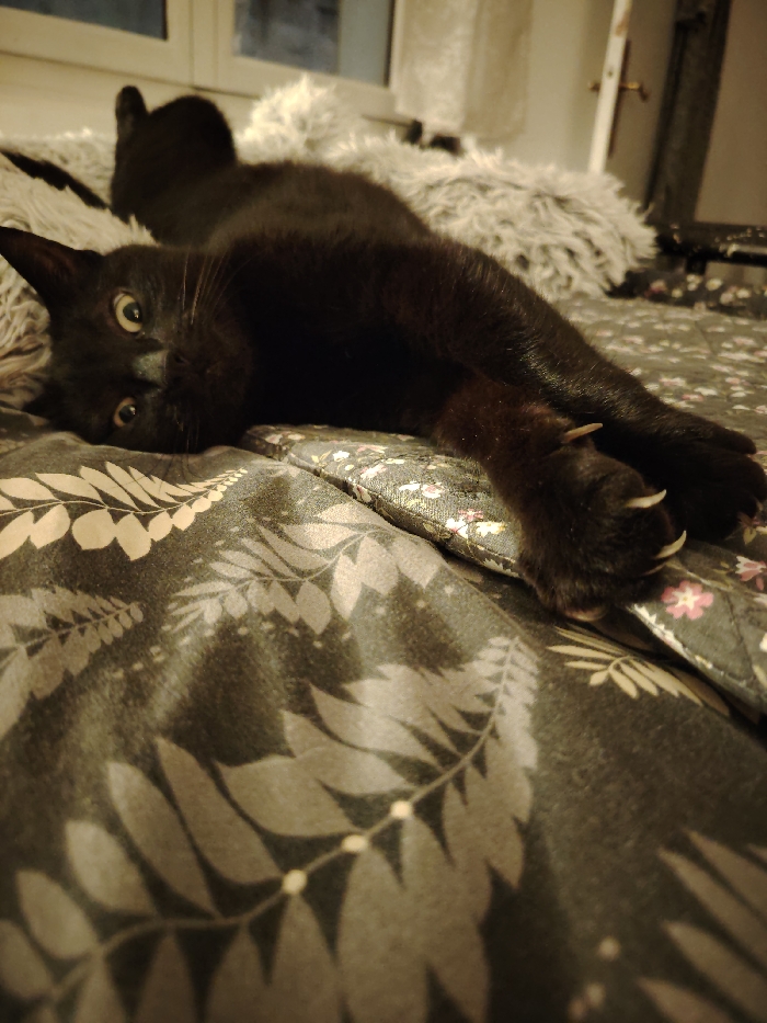 - "A black cat rests on a bed with a patterned gray and white leafy design" by FM-StHk23, licensed under CC BY 4.0
