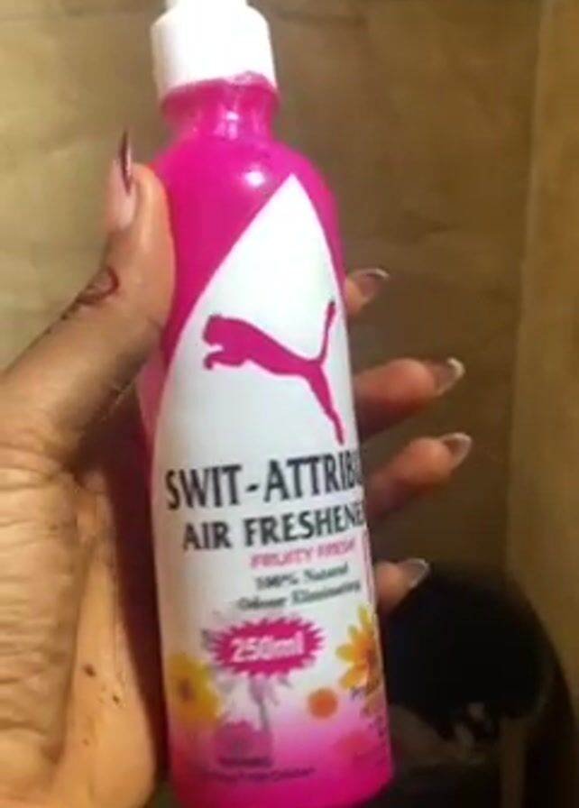 A person holds a pink and white bottle labeled “Swit-Attribut Air Freshener” in their right hand, rotating it to show the label and back
