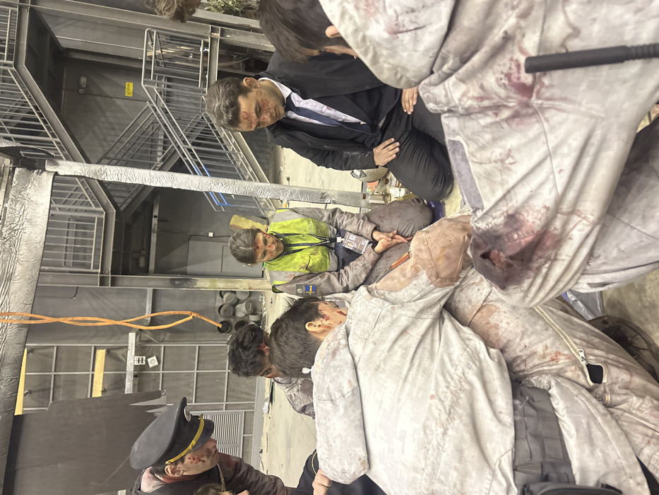 This image depicts an indoor scene set within a large industrial or studio environment, characterized by a concrete floor, metal structural elements, and a multi-level metal staircase with railings in the background. The specific location within Huangdao District, China, is not discernible from the visual information. Approximately seven to eight individuals are closely gathered on the floor, some kneeling or crouching, with most exhibiting simulated injuries indicated by artificial blood on their faces and clothing. In the upper left quadrant, a man in a dark uniform with a peaked cap adorned with gold braiding leans forward, observing the central group. Simulated blood is visible on his forehead and left cheek. Adjacent to him, another individual's head, also with simulated blood, is partially visible. In the mid-ground, a woman kneels, wearing a grey long-sleeved shirt under a bright yellow-green high-visibility vest. A patch resembling the Swedish flag is on her left sleeve, and an ID badge hangs from a lanyard around her neck. Her hands are clasped, and simulated blood marks her forehead and nose. Next to her, a man in a dark suit jacket, white shirt, and blue tie kneels, looking downwards, with simulated blood on his forehead and cheeks. In the foreground and center, several individuals wear light-colored, possibly tan or grey, jumpsuits or overalls. These garments are extensively stained with simulated blood. One subject in the immediate foreground displays a prosthetic wound on their left forearm/elbow area, accompanied by dark red simulated blood. Another individual, seen from behind, also wears a blood-stained jumpsuit. On the floor near the kneeling woman, various small bottles, containers, and what appear to be medical supplies are present. An orange coiled cable hangs vertically in the upper left background. The overall scene suggests a staged event, such as a simulation, training exercise, or production, depicting the immediate aftermath of a traumatic incident.