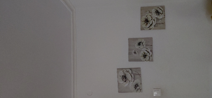 The image displays an interior room located in Ilion, Greece. A textured white wall occupies the foreground, meeting a flat white ceiling adorned with a simple crown molding. Three rectangular canvas prints are mounted horizontally on the wall. Each print features stylized floral imagery, consisting of light-toned flowers with dark centers set against a light, neutral background. The prints are arranged with the left one positioned highest, and the center and right prints slightly lower and staggered. Below and to the left of the leftmost print, a white rectangular light switch with two toggle switches is affixed to the wall. A faint, circular mark or indentation is visible on the upper left section of the wall. No individuals, actions, or discernible interactions are present in the scene.