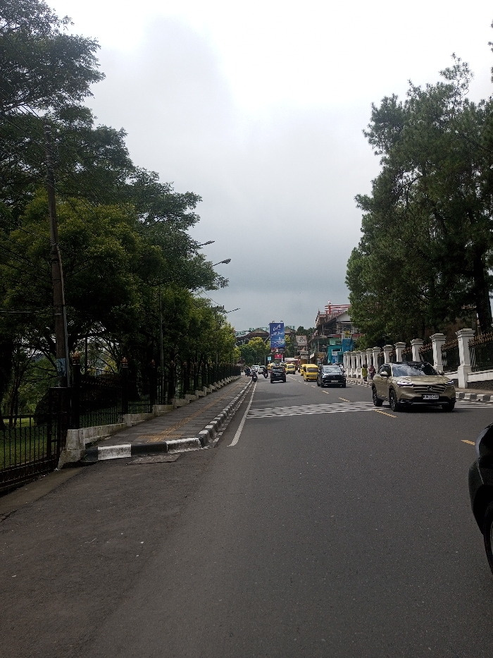 This image depicts a wide-angle view of a multi-lane asphalt road in Thanthirimale, Sri Lanka, on an overcast day. The road, which features a prominent white-striped pedestrian crosswalk in the mid-ground, extends into the distance with traffic flowing away from the camera's perspective. On the left side of the road, a dark utility pole with overhead wires stands in the foreground, preceding a continuous black metal fence that borders a verdant, tree-filled area. A sidewalk with a black and white striped curb runs parallel to the fence, lined by multiple dark streetlights with single luminaires. Dense green foliage from various trees creates a canopy over this side of the street. The right side of the road is bordered by a white decorative fence featuring evenly spaced pillars and dark metal railings. Behind this fence, several coniferous trees are visible, followed by a streetscape of multi-story buildings, some with painted facades (e.g., light blue). A large billboard with blue and white elements is visible above the buildings in the mid-distance. Traffic on the road includes a light gold/tan SUV in the foreground, bearing a license plate partially visible as "E 345 CC", followed by a dark sedan. Further down the road, additional vehicles include multiple yellow cars (possibly taxis or auto-rickshaws), more dark sedans, and a motorcycle with a visible rider positioned between other vehicles. The overall scene indicates an active urban or semi-urban thoroughfare.