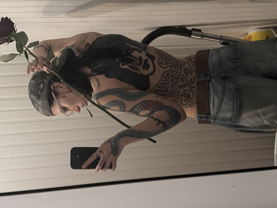 The image displays an adult individual, positioned in an indoor setting in Sofia, Bulgaria, captured via a mirror selfie. The person is viewed primarily from the left side and back, revealing extensive tattooing across the left arm, shoulder, and entire back. A dark, possibly distressed, cap is worn on the head, and clear-framed eyeglasses rest on the face. A cigarette or similar rolled item is situated between the lips. The left arm features a prominent blue-grey snake tattoo with red accents. The back is heavily tattooed, exhibiting a large, dark, stylized face design on the upper back, below which are intricate line-art patterns resembling classical or mythological motifs, including what appears to be a winged figure and architectural elements. The person wears light-wash blue jeans secured with a brown belt. A black smartphone is held in the left hand, angled to capture the reflection. The right hand is raised, holding a single, wilting dark red rose by its stem. The background consists of a white wall with vertical paneling. A black vacuum cleaner, featuring a silver extension tube and a yellow base, stands against the wall on the right side of the frame.