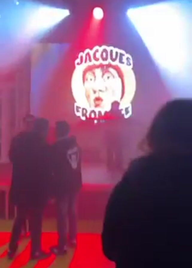 group of people standing around in a dimly lit room. In the background, a screen displays an image of a person with the words "Jacques Fromage" written above their head. The image is surrounded by bright lights, and the room is filled with smoke.