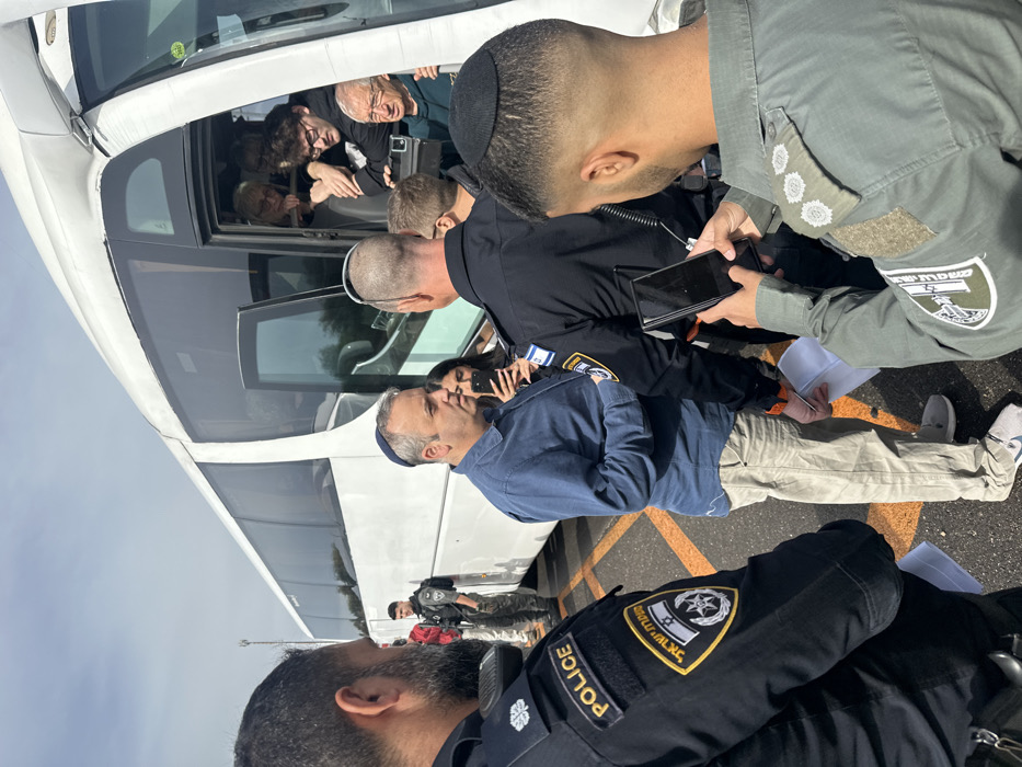 A white bus with people visible in the front windows. A man wearing a kippah is standing in front of the bus in a blue shirt and tan pants. A woman is holding a phone near his face. Police officers surround the man, with patches reading "POLICE" in English and Hebrew. One officer is holding a tablet. The setting appears to be a parking lot with yellow lines on the pavement.