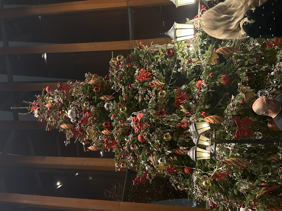 The image captures an indoor scene in Barvikha, Russia, featuring a large, heavily decorated Christmas tree