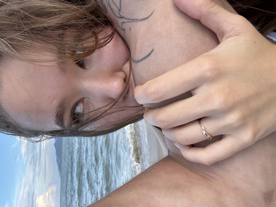 A young woman hugs a tattooed arm, posing on a sandy beach with a light blue ocean and cloudy sky in the background. Her face is partially obscured by strands of brown hair. She has fair skin and is wearing a ring on her left hand. Her eyes are open, and she's looking off to the side. The arm has a tattoo.