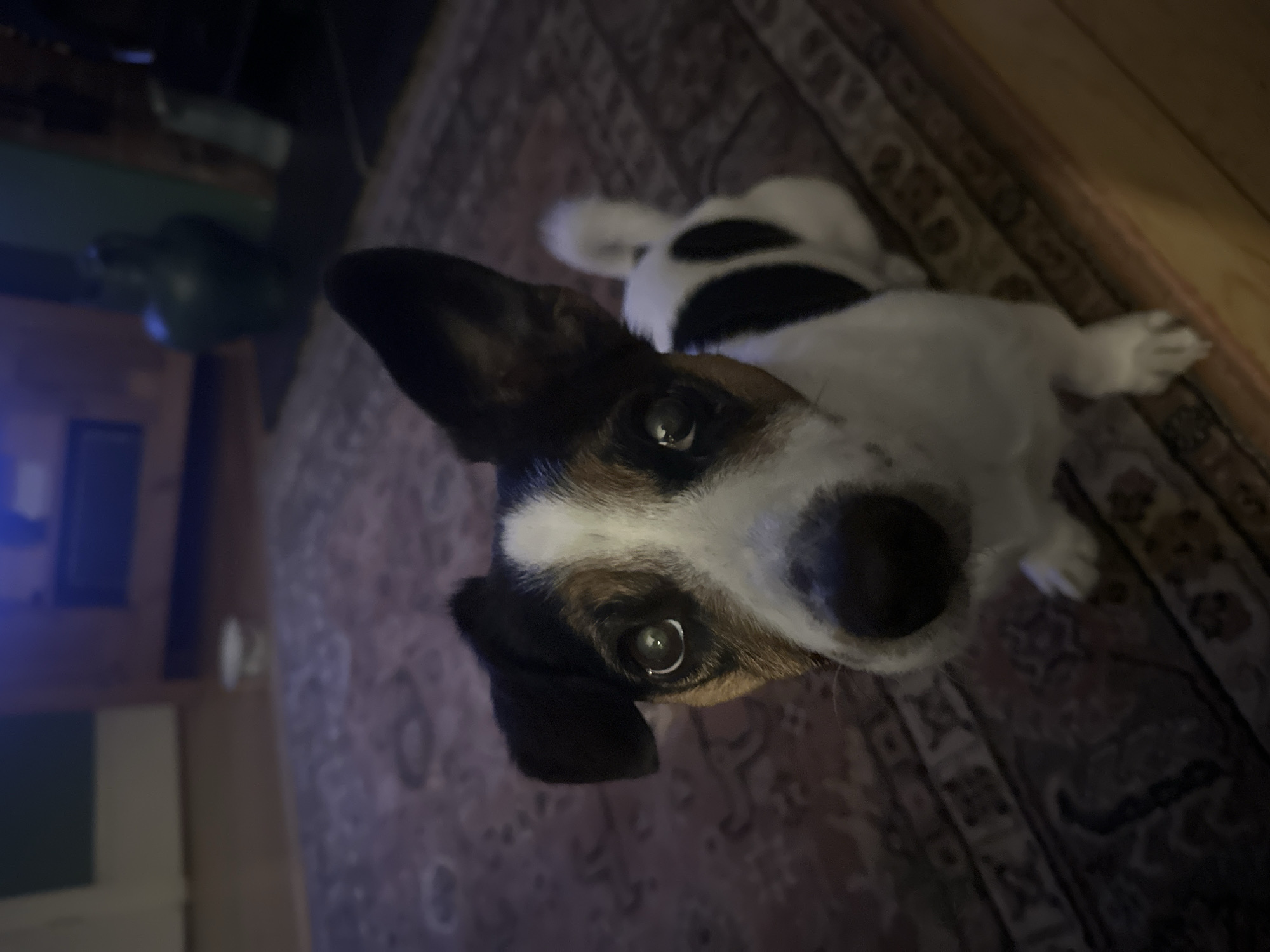 The image depicts a small, tricolored dog, primarily white with black and tan markings, positioned centrally in an indoor domestic setting in Salisbury, United Kingdom. The dog, likely a terrier breed, has a white head with tan patches above its dark eyes and black patches around its ears; one ear is erect while the other is partially flopped. Its nose is black. The dog is looking directly upwards towards the camera, appearing attentive. Its body is mostly white with a distinct black patch visible on its left side. The dog is situated on a patterned rug featuring muted red/burgundy and cream/beige tones with intricate designs. The rug partially covers a lighter wooden floor, visible in the foreground and right side. In the background, to the right of the dog, a dark green or black vase rests on a dark mat. Further back and right, a dark wooden cabinet or shelving unit is visible, with a faint blue light source emanating from within or above it. In the middle-left background, a white cup or container is present on the wooden floor beyond the rug. The scene is dimly lit, with reflections in the dog's eyes indicating artificial light sources. No human individuals are visible.