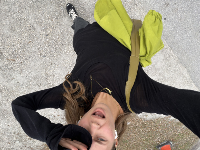 An overhead selfie shows a person on a concrete or gravel surface. They wear a long-sleeved black shirt, dark leggings, and black sneakers with white laces. A green bag hangs over their shoulder. They are smiling with their mouth open and appear to be holding their hand to their head. White earbuds are visible, and they are wearing a gold necklace. A small, red and grey object is near their feet. The image is rotated, so the feet point towards the top of the frame.