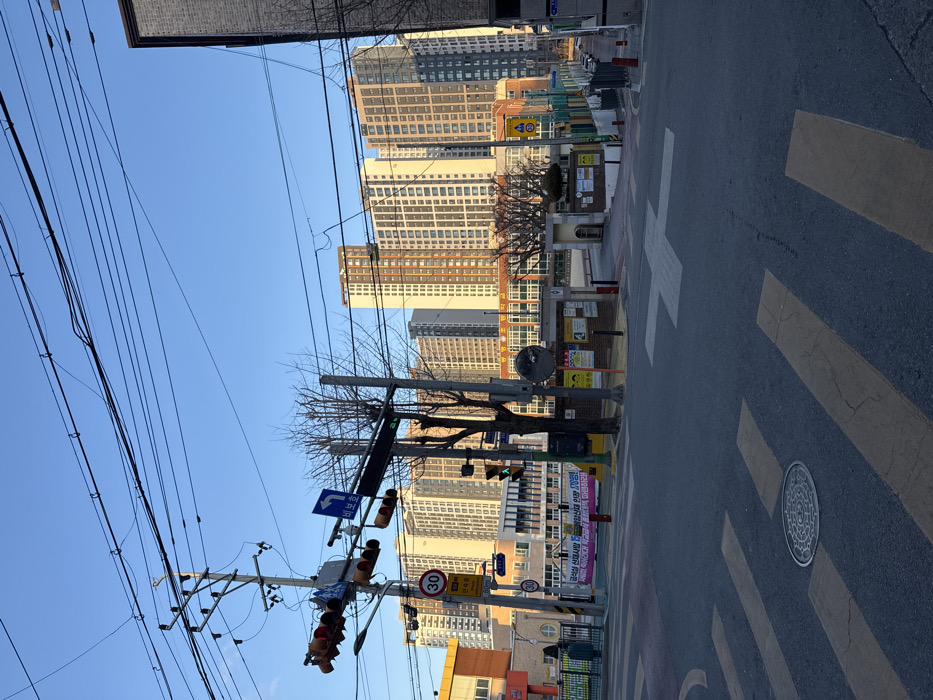 A street scene with tall buildings in the background is captured on a clear, sunny day. Traffic lights hang above the street, tangled in power lines. A pedestrian crossing is visible in the foreground. The street is empty and stretches between buildings that vary in height and color. The sky is blue, and the buildings appear to be a mix of residential and commercial properties.