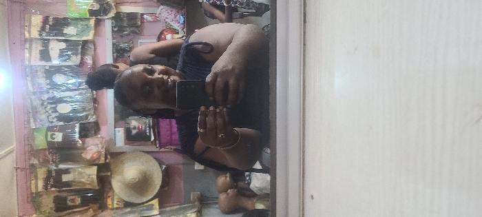 An image taken from a mirror perspective depicts a smiling Black woman taking a selfie with a dark-colored smartphone, held in both hands. She wears a dark blue top and has braided hair. A ring is visible on her left ring finger, and a bracelet on her left wrist. The mirror reflects the interior of a hair salon or beauty supply shop with pink walls. Behind the woman, numerous packages of hair extensions are displayed, hanging from hooks on the wall. A light-colored straw hat hangs on the left side of the wall, above two bald, light-brown mannequin heads. Another person, partially visible from behind, stands to the right of the main subject. The foreground shows a light-colored counter where the mirror rests. The scene is consistent with a hair salon located in Abuja, Nigeria.
