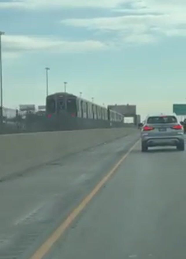 The video, taken from inside a car, shows a highway with a train on elevated tracks