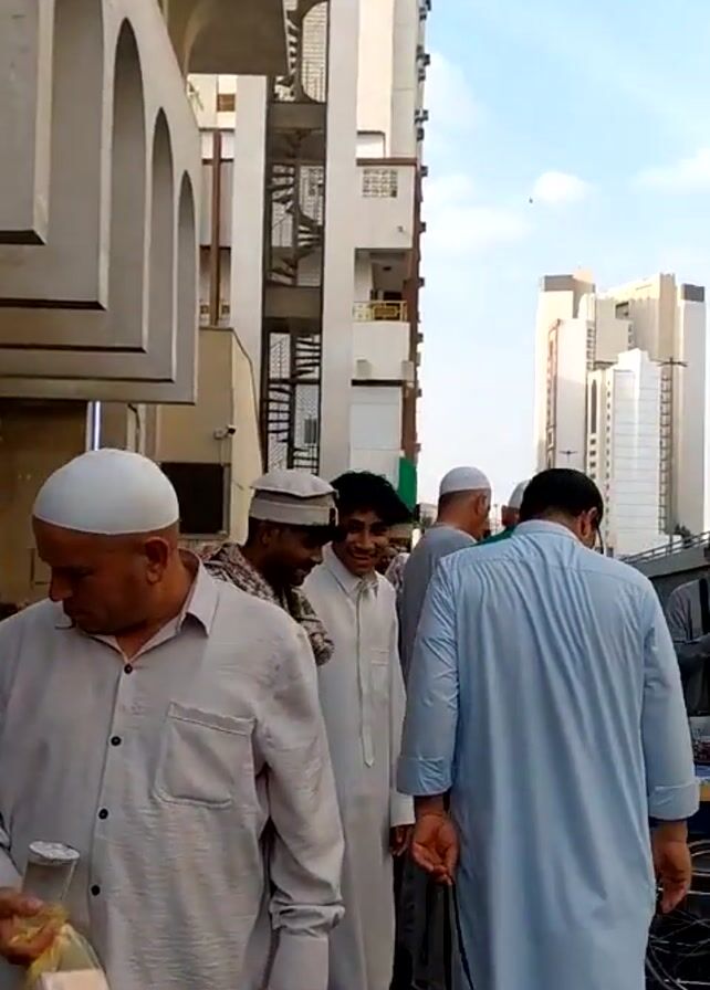 group of people, primarily men, in an outdoor urban setting. Most of the men are wearing traditional Muslim attire such as white caps and thobes (long robes). Some are also wearing casual shirts and pants. Many of the men appear to be preparing for prayer, laying out prayer rugs and rosaries. Some are engaged in conversation, with smiles exchanged among a few of them. The environment consists of modern buildings and architecture with arched features. The sky is visible and appears to be clear. There are signs in the background, some written in what seems to be Arabic. A wheelchair is visible in the background, next to what appears to be a table. There's a general sense of community as people prepare for prayer.