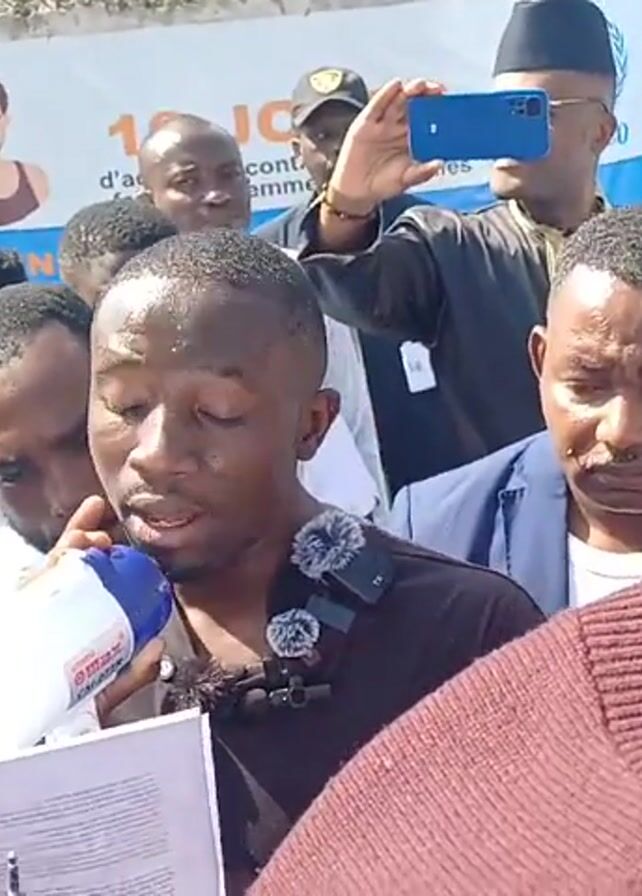 . The video shows a group of people surrounding a man who is speaking into a megaphone. The man is holding a piece of paper and reading from it. The group is standing in front of a building with barbed wire on top. The people surrounding the speaker appear to be reporters or members of the press. One of them is holding a phone and recording, while others are holding cameras. A banner with a photo of a woman is partially visible in the background.