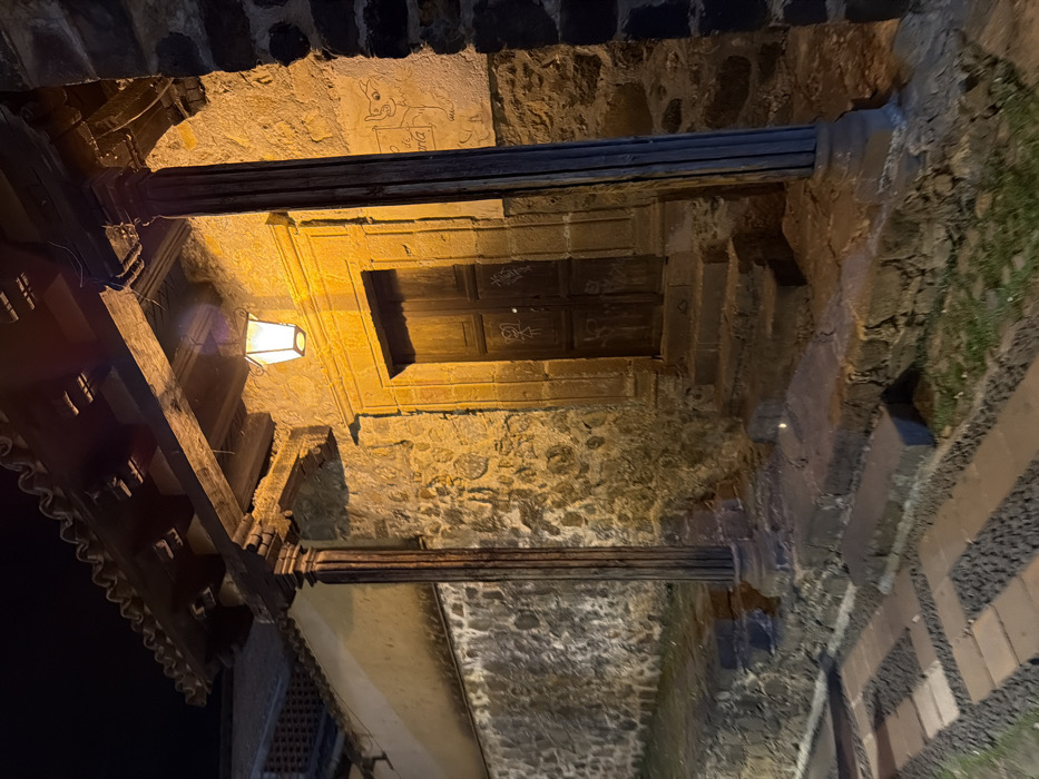A dimly lit outdoor scene reveals an old stone structure. A covered entrance, supported by dark wooden beams and columns, frames a closed wooden door. A lantern glows near the entrance. Rough stone walls are visible on either side, with grass and patterned pavement glimpsed on the right. Graffiti marks the wall above the door. The image is rotated, giving a distorted perspective.