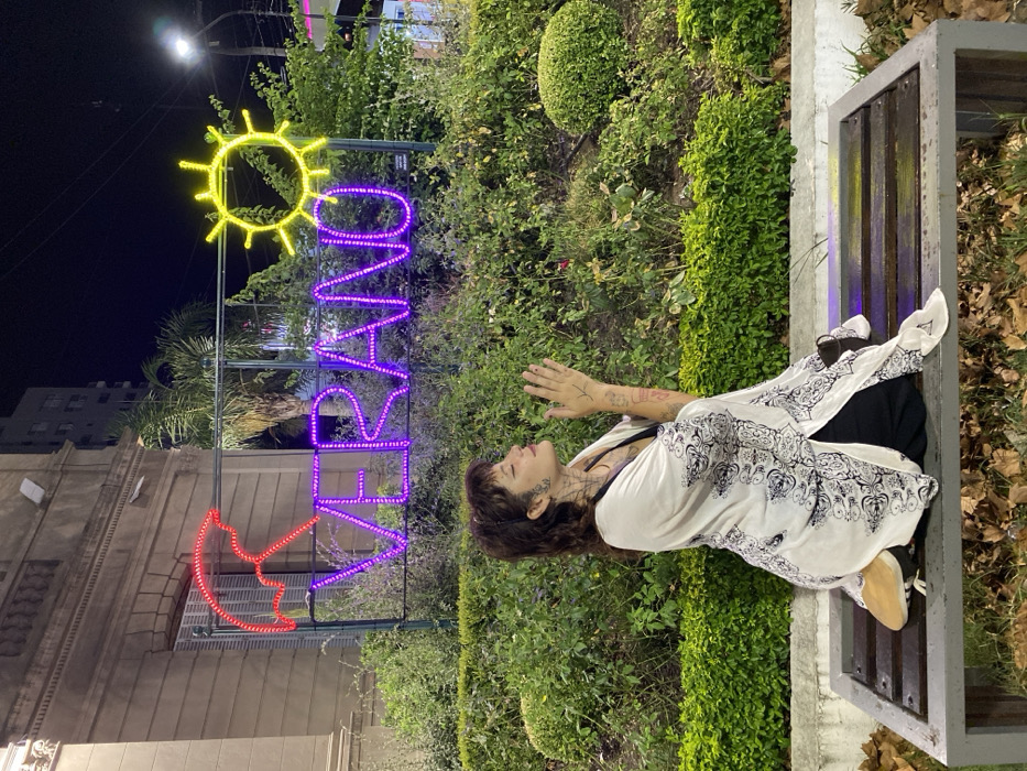A woman with tattoos sits on a bench in a park. She has her hands together in a prayer position. Behind her is a sign in the shape of a sun, the word "VERANO" and an umbrella. All three are illuminated by neon lights. The surrounding area is lush with greenery, including bushes and trees. A building is visible in the background.