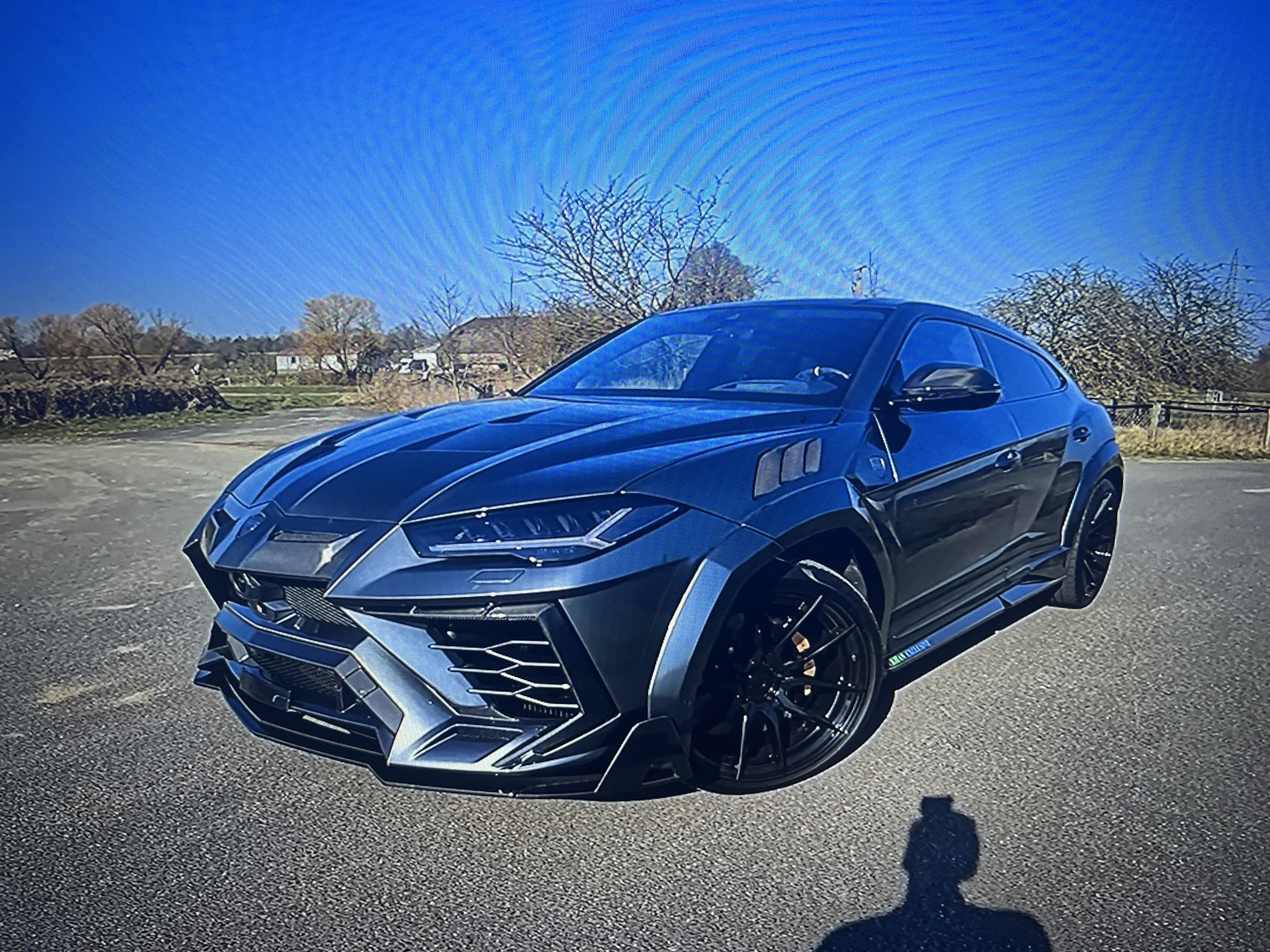 A heavily customized dark gray Lamborghini Urus SUV is depicted stationary on a paved asphalt surface in Oreshak, Bulgaria. The vehicle features an aggressive wide-body kit, including a distinct front bumper with large geometric grilles, flared fender arches, and black multi-spoke wheels. A green "ARMYTRIX" decal is visible on the lower section of the driver's side skirt. The environment consists of a clear, bright blue sky dominating the upper frame. In the background, sparse deciduous trees with bare branches are visible, suggesting a late autumn or winter season. Distant buildings, including a light-colored structure and a white van, are partially discernible amidst the trees. A distinct human silhouette, showing the head and shoulders, is cast on the asphalt in the lower right foreground, indicating the presence of a person (likely the photographer) to the right of the vehicle.