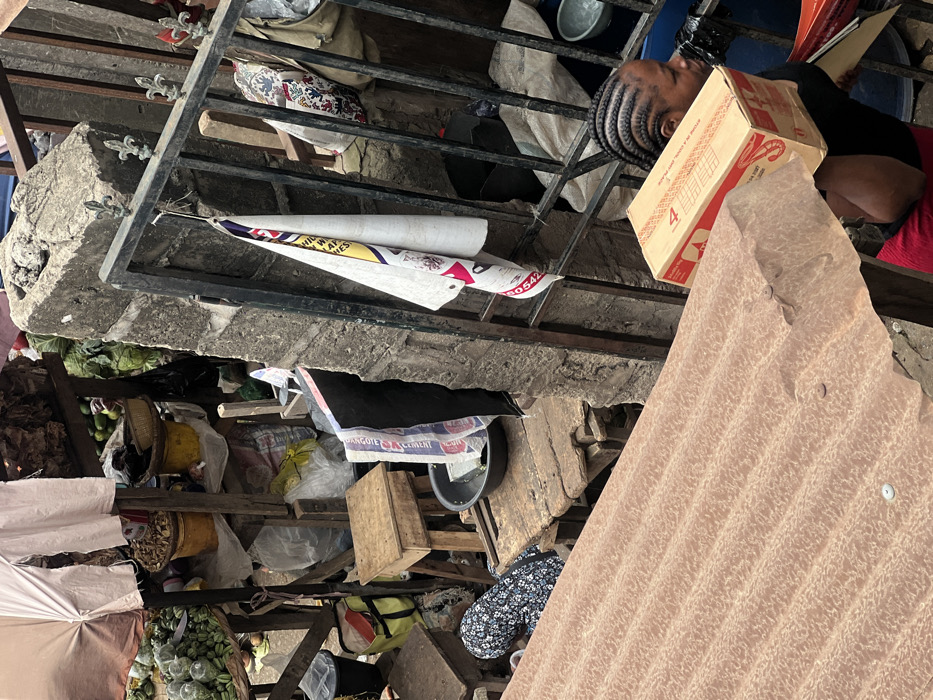 This elevated view captures a section of an outdoor market in Egan, Nigeria. In the foreground, a textured, light brown corrugated metal roof occupies the lower left. Above the roof on the right, a woman with tightly braided hair, wearing a dark top and red lower garment, carries a light brown cardboard box marked with a prominent red "4" on her right shoulder, her head turned to the right. Adjacent to her, a black metal gate featuring fleur-de-lis finials is attached to a rough concrete pillar. A white and multicolored patterned cloth hangs from the gate. Behind the gate and pillar, an informal market environment unfolds, constructed from rough wooden planks and posts forming stalls and shelving. A person wearing a dark blue garment with a white floral pattern is partially visible, bending or seated behind a low wooden platform on the left. The scene is densely packed with merchandise and objects: various plastic containers (some yellow, some black), clear plastic bags, green leafy produce, and other items in baskets. A large white sack with red printing hangs near a stall, and a light-colored umbrella is visible in the background, partially covering a stall area. Small wooden stools are also present.