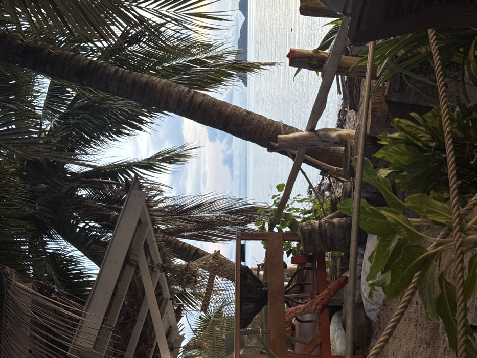 This image depicts a coastal scene in Baan Sri Thanu, Thailand, captured at what appears to be either sunrise or sunset, evidenced by the soft, diffused light and cloud patterns. The viewpoint is from beneath an open-air structure, likely a beachfront establishment. In the upper left quadrant, a section of a light-colored roof structure with exposed support beams is visible. Below this, a dark, net-like hammock or hanging basket is suspended. Further down, a wooden elevated platform or railing, stained red in some areas, extends horizontally. The midground is dominated by multiple large palm trees, with their fronds partially framing the sky and ocean. One thick palm tree trunk angles prominently from the upper right toward the lower center-right. A rustic wooden fence or barrier, constructed from upright posts and horizontal beams, runs along the sandy ground, separating the foreground from the immediate waterline. Some of these wooden posts exhibit red-painted tops. The sandy area shows scattered natural debris. Lush green tropical plants are visible in the lower foreground, positioned behind a braided rope barrier that traverses the bottom of the frame. The background features a calm, reflective body of water, likely the Gulf of Thailand, stretching to the horizon. Distant islands or landmasses are silhouetted against the diffused sky, which contains soft white and light grey clouds. No individuals or active interactions are visible within the scene.