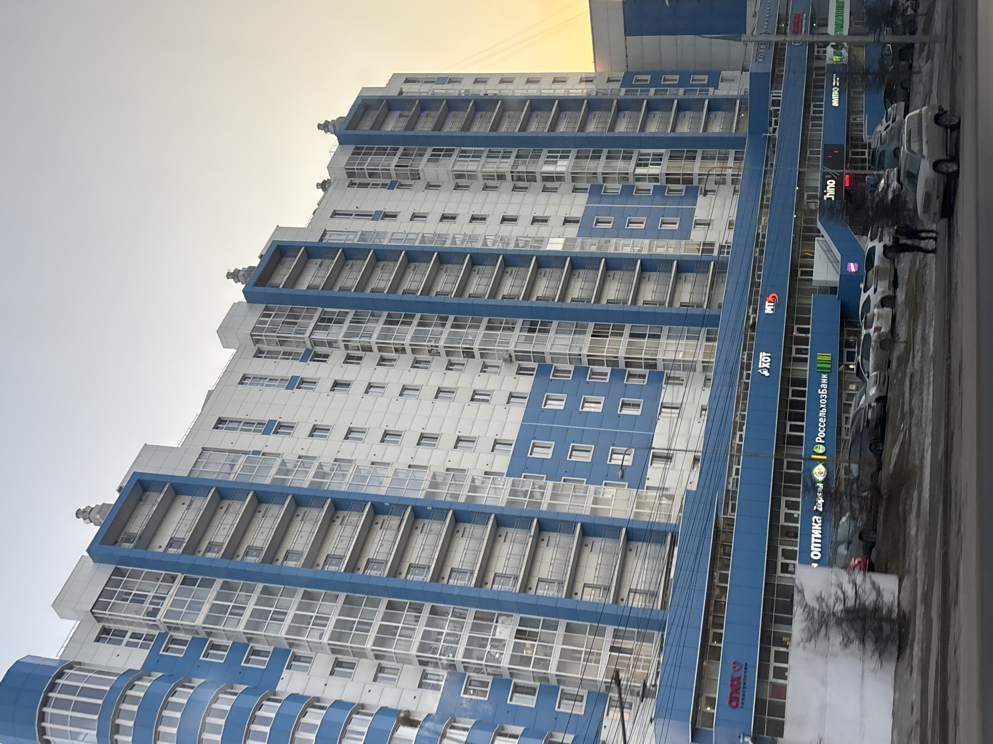 The image depicts a large, multi-story residential and commercial building located at Ulitsa Baykalskaya, 202/6, in Irkutsk, Russia. The structure features a distinctive blue and white facade, with numerous windows and balconies. A prominent cylindrical tower element is visible on the far left. The ground floor of the building is dedicated to commercial establishments, indicated by various illuminated signs. Visible businesses include: "СИМЭКС" (SIMEX), "Оптика Зоркая" (Optika Zorkaya - an optician), "Россельхозбанк" (Rosselkhozbank - a bank), "ХОТ" (Hot), "МТС" (MTS - a mobile network operator), "Chino" (likely a restaurant), and "Invitro" (a medical laboratory). A partial sign for a "СТОМАТОЛОГ" (dentist) is also discernible. In the foreground, a paved street and a parking area are visible, accommodating several parked vehicles including sedans and SUVs of various colors. A light-colored SUV is prominently positioned in the mid-ground, facing right. Several individuals are present on the ground level. Two figures, dressed in dark winter clothing, are standing near the light-colored SUV. Another individual is visible further to the left near parked cars. The environment is an urban setting, with sparse, bare deciduous trees or bushes in the foreground. Overhead utility lines traverse the scene. The sky is overcast with a light yellow-orange tint on the right, suggesting either early morning, late afternoon, or atmospheric conditions. The ground appears to have patches of dirt and possibly remnants of snow, indicative of cooler weather.