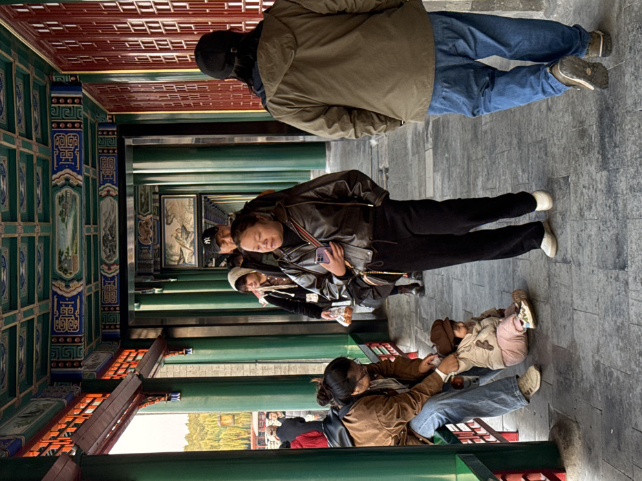 The scene depicts a traditional Chinese covered corridor in Xicheng District, China, characterized by ornate, multi-colored ceiling beams featuring intricate patterns and landscape paintings in green, blue, red, and gold