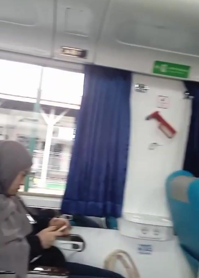 interior of a train carriage. The seats are blue and grey, arranged in rows, with seat numbers visible. Some passengers are present, including a woman wearing a grey hijab sitting by the window and looking at her phone. Overhead luggage racks are visible, and blue curtains hang by the windows. There is a fire extinguisher mounted on the wall. The camera moves slightly, showing more of the carriage interior. The lighting is bright.