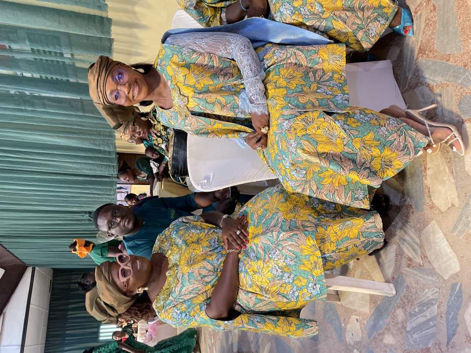 An indoor photograph depicts a social gathering in Barakin Lerawi, Nigeria, featuring two women in the foreground seated on white chairs, smiling towards the camera