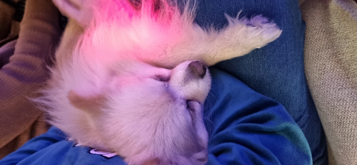A sleeping dog is nestled on a person's lap. The dog has white fur, a visible paw, and a dark nose. The person is wearing blue clothing, and the dog is resting on the fabric. Soft, pink light illuminates the dog's upper fur, creating a dreamy and warm effect. The background includes denim jeans and the textured surface of a couch, suggesting a relaxed and comfortable setting.