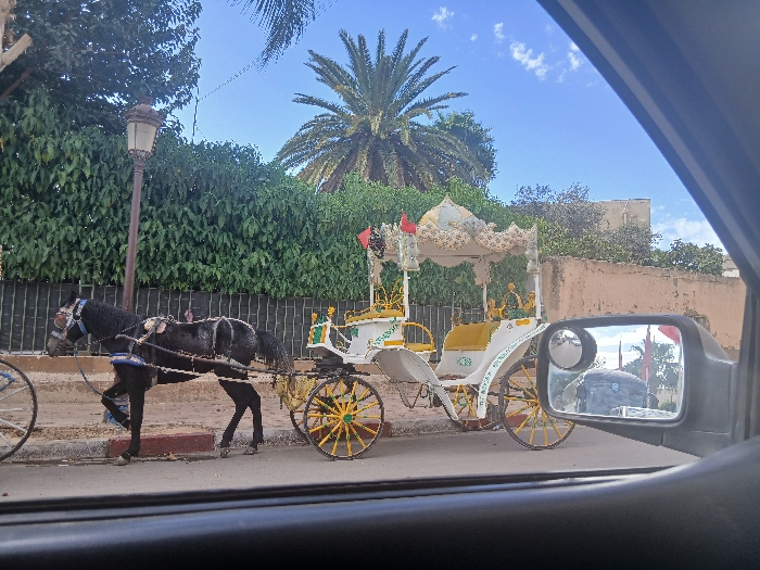 - "A black horse is harnessed to an ornate white and yellow horse-drawn carriage on a paved street in Al Machouar – Stinia, Morocco" by FM-hxXv93, licensed under CC BY 4.0