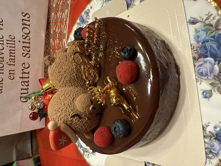 This image depicts a festive chocolate cake situated indoors within the city of Kawasaki, Japan. The round chocolate cake features a glossy dark ganache topping. It is adorned with two textured brown bear figures, one larger and one smaller, positioned centrally; the larger bear wears a red and white Santa hat with a snowflake pattern. Other decorations include a gold-colored "Happy Christmas" script, a small gold-colored leaping reindeer, two red raspberries, two dark blue blueberries, and a cluster of miniature red and silver jingle bells with a green artificial pine accent. The cake rests on a white cardboard base, which is placed on a white porcelain plate with a blue and purple floral rose pattern. A red tablecloth or placemat underlies the plate. In the background, a light-colored paper gift bag is visible, bearing French text that reads "une nouvelle vie en famille quatre saisons." Behind the bag, a red surface with a gold geometric pattern is partially visible. No individuals are present in the scene.