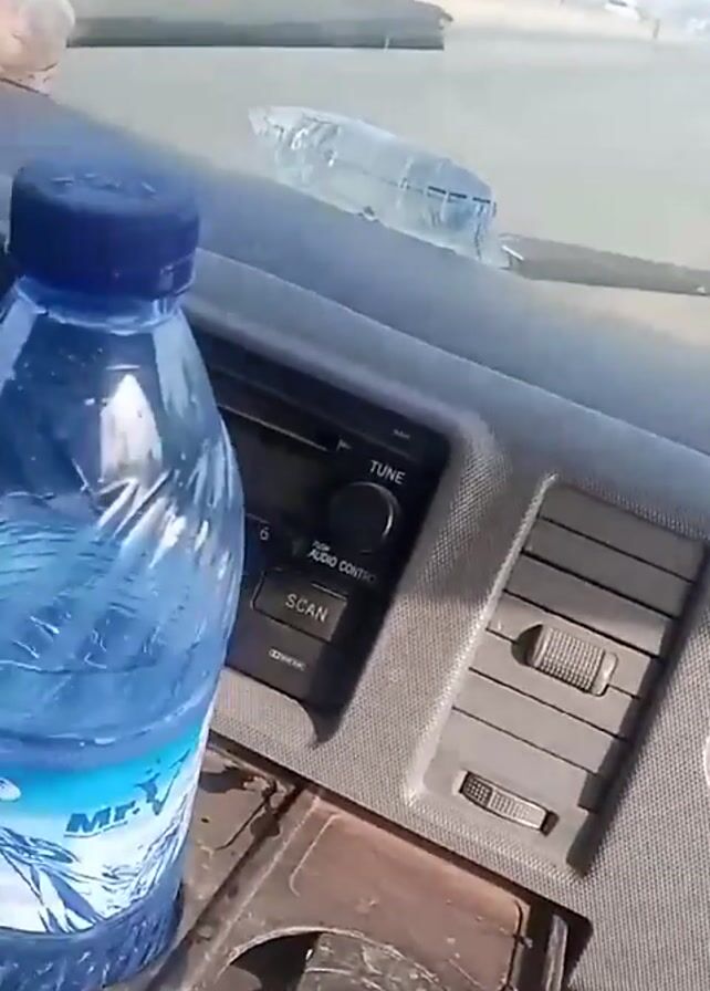 interior of a vehicle driving along a road. The dashboard is visible, with a radio, air vents, and a cupholder. A bottle of water is placed in the cupholder. Through the windshield, the road and surrounding environment are visible, including buildings, other vehicles, people on bicycles, and street signs. The video seems to be taken from the driver's perspective. The video is shaky. The weather appears sunny.