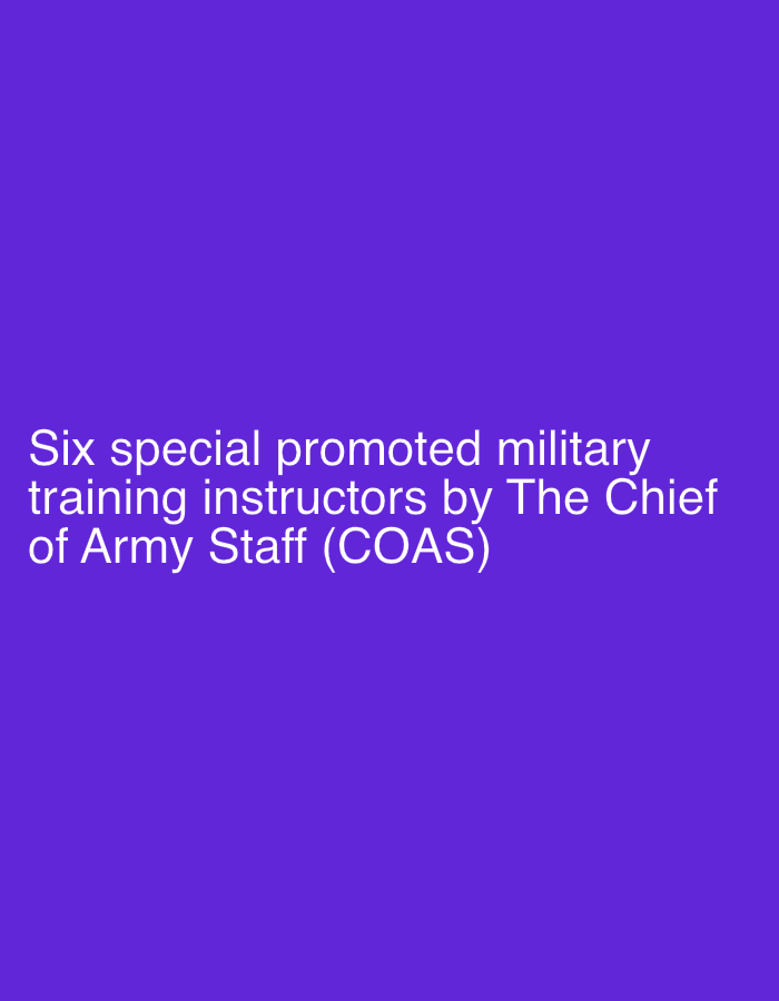 The image displays a uniform purple background with white, sans-serif text superimposed on the lower portion. The text is arranged across three lines and reads: "Six special promoted military training instructors by The Chief of Army Staff (COAS)". No discernible location, specific individuals, objects, actions, interactions, or environmental features are visually depicted in the image. The image content does not provide any visual information regarding a location in the city of Kachia, Nigeria.