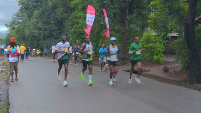 The image depicts a road race in Moshi, Tanzania, occurring on a damp asphalt road under an overcast sky