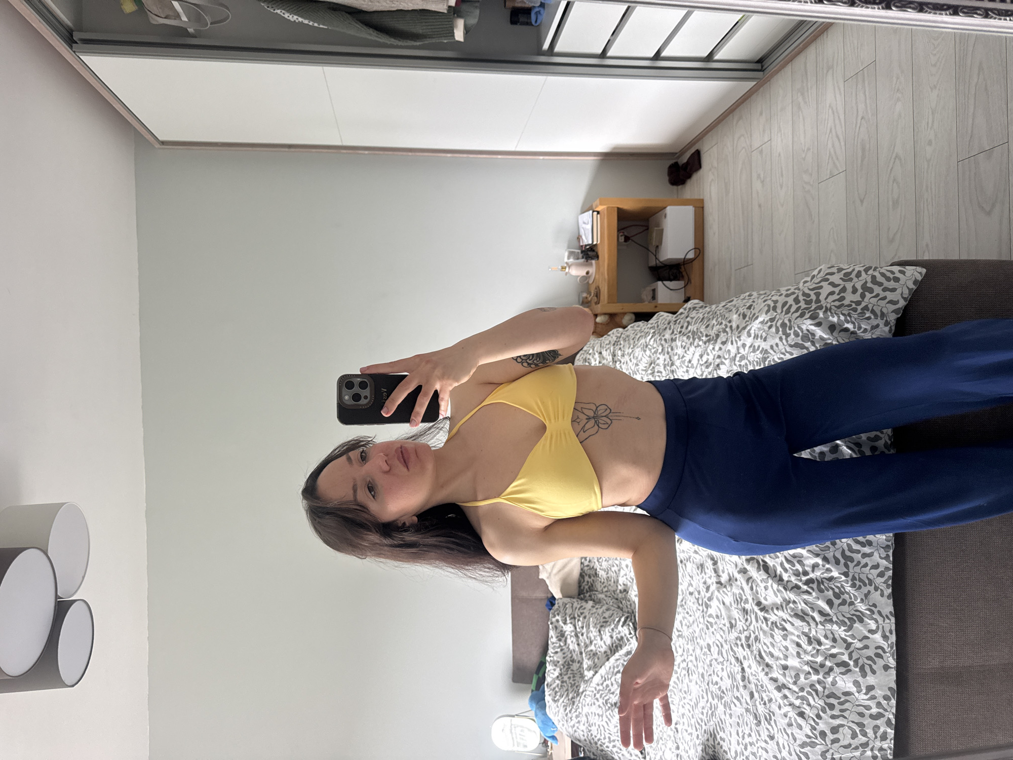 A woman is taking a selfie in a bedroom. She is wearing a yellow crop top and blue pants. The bedroom has a bed with a patterned comforter, a nightstand, and a wardrobe. The location appears to be indoors, and there is no information suggesting this image was taken in Burgas, Bulgaria.