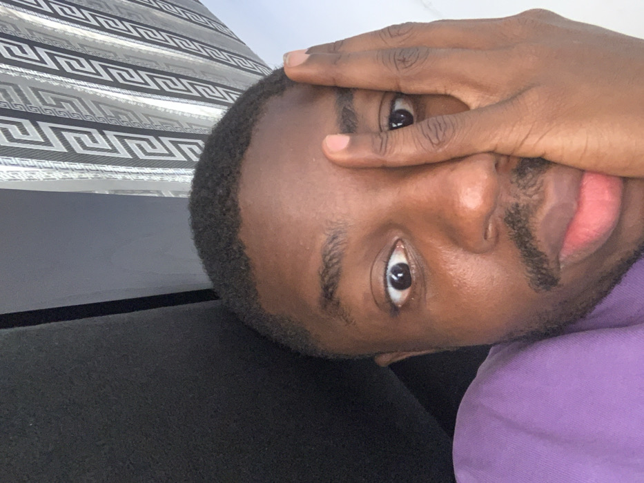 The image depicts a close-up, high-angle view of a male individual within an indoor setting in Barakin Lerawi, Nigeria. The subject has dark skin, short dark hair, and stubble on his upper lip and chin. He is wearing a purple collared shirt. His left hand is positioned over the right side of his face, obscuring his right eye, nose, and the right portion of his mouth. His left eye is wide open, with the pupil and iris clearly visible, and is directed towards the camera. His lips are slightly parted. The background reveals a patterned curtain with a repeating grey Greek key design on a white fabric, visible in the upper right quadrant. A dark, possibly black, surface is present in the upper left, adjacent to a lighter grey wall segment. The scene is evenly illuminated.