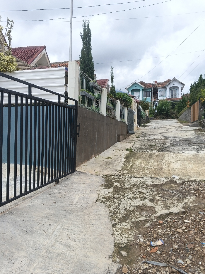 The scene depicts an uphill residential street in Unknown, Vietnam, under an overcast sky. In the foreground on the left, a black metal gate with vertical bars is positioned, revealing a blue-painted wall behind it. A concrete driveway section leads up to the gate, which transitions into a rough, unpaved area of exposed soil, gravel, and scattered debris, including a visible crumpled wrapper. A dark gray concrete retaining wall runs along the left side, topped by a white corrugated fence and a metal spiked fence. Beyond this barrier, red-tiled rooftops and a tall, slender conifer tree are visible. A light-colored utility pole ascends on the far left against the sky. The concrete road, exhibiting extensive cracks, erosion, and discolored patches, ascends and curves gently to the right. On the right side of the street, multiple residential structures with red-tiled roofs and varying facades, including a prominent light blue house with white trim, are situated amidst dense greenery and retaining walls lining the uphill slope. Overhead utility lines are faintly visible traversing the cloudy sky, with distant, hazy hills forming the background. No individuals, animals, or active vehicles are present in the frame.