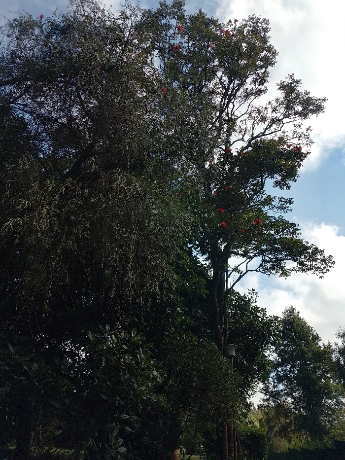 The image displays an outdoor scene in Ngecha Tigoni ward, Kenya, dominated by dense vegetation under a partially cloudy sky. No individuals are present. On the left, a large tree with fine, dark green, drooping foliage occupies the frame. To its right, a taller tree with a visible trunk and branches features distinct clusters of bright red flowers or berries among its green leaves. A white, cylindrical object is affixed to the trunk of this taller tree, approximately midway up its visible section. The lower portion of the image shows additional dark green shrubbery and foliage. The background consists of a bright blue sky with scattered white cumulus clouds, indicating daytime conditions.