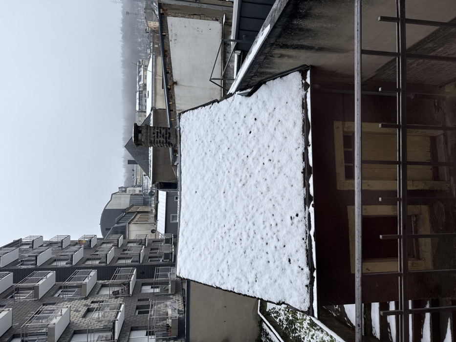 This image displays an urban landscape in Pétange, Luxembourg, under an overcast sky during winter conditions. The perspective is elevated, looking down into a city block and across to a distant hillside. In the immediate foreground, a dark metal railing, likely part of a balcony or window frame, extends horizontally across the lower quarter of the frame. Directly behind this railing, a small, dark brown building with a gabled roof, uniformly covered in a thin layer of snow dotted with dark specks, occupies the center of the midground. The visible side of this building features two recessed rectangular openings: one dark red-brown and the other light tan, resembling doors or window frames. To the left of this structure, a small patch of ground shows sparse green vegetation with a light dusting of snow, and steps also covered in snow descend out of view. To the right, a concrete wall and a flat, dark-colored roof structure are visible. Further into the scene, a brick chimney stack rises from a dark-tiled roof. To the left, a modern multi-story apartment building with dark grey, possibly slate, cladding features numerous balconies with silver railings and white roller shutters on its windows. In the background, various other buildings of differing architectural styles and heights are visible, including older structures with dark roofs and a larger, lighter-colored building. The distant horizon is characterized by a snow-dusted, tree-covered hillside partially obscured by haze or mist. No individuals or active interactions are visible.
