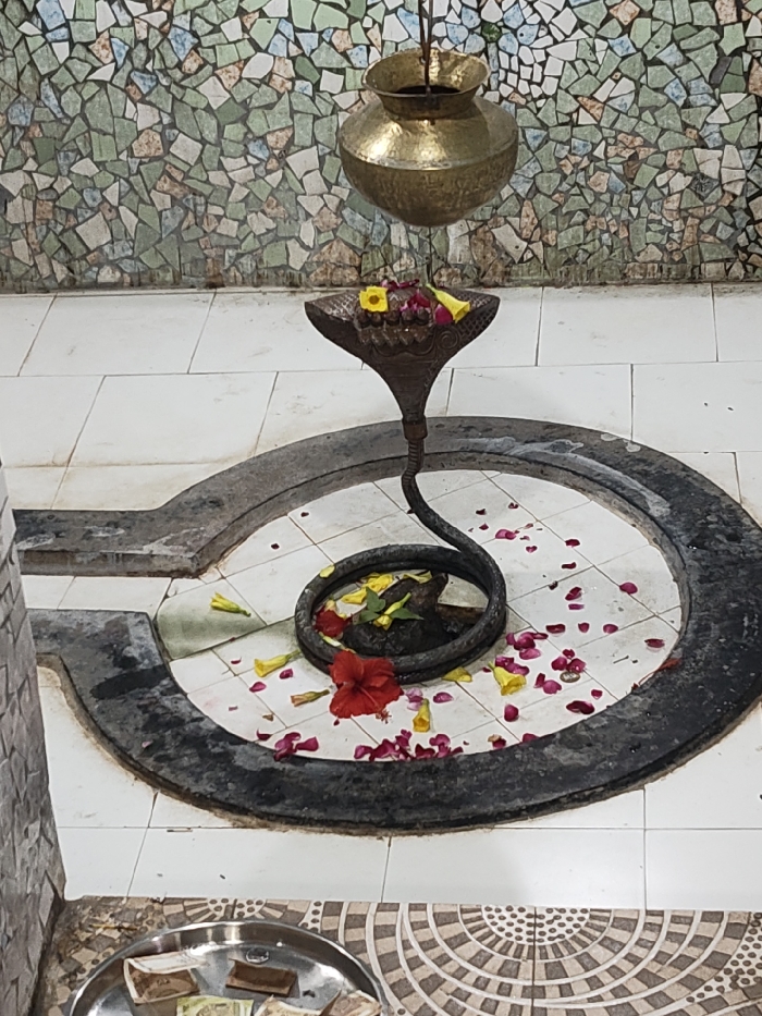 The image displays an interior scene from a structure in Veraval, India, centered on a religious shrine. A dark-colored Shiva Lingam stone rests within a circular, dark grey stone yoni base, which features an integral outflow channel extending left. A dark, coiled cobra figure, likely cast metal or carved stone, rises from the yoni, its head with a fanned hood positioned above the Lingam. Floral offerings, including a red hibiscus, yellow bell-shaped flowers, and various pink and yellow petals, are scattered around the Lingam and draped over the cobra's head. Suspended directly above the cobra is a brass-colored metallic pot, equipped with a narrow spigot at its bottom. The floor is covered with white, square ceramic tiles. In the lower foreground, a section of brown-toned floor tiles with a concentric semi-circular pattern is visible. A silver-colored metal plate rests on these patterned tiles, containing crumpled Indian rupee currency notes and several small, dark, rectangular objects. The background wall features a mosaic composed of irregular, multi-colored tesserae in shades of green, brown, and white. No individuals are present in the scene.