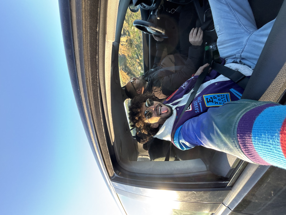 Two people are inside a car with the top open. One is driving, and the other is leaning back, sticking his tongue out, and wearing sunglasses and a colorful jacket with the word "SAVAGE" visible. The sky is blue and bright, and the car is in motion, as blurry trees are visible in the background.