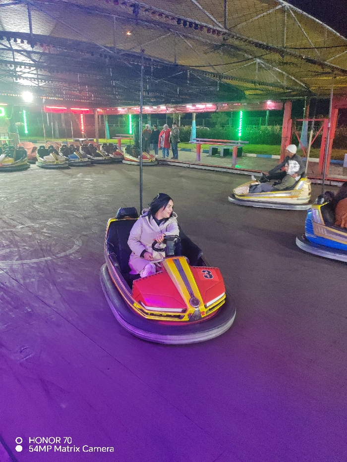 Under a bright, fairground-like canopy, a woman in a light-colored coat sits in a red and yellow bumper car with the number "3" on it. Several other bumper cars are visible, some occupied, in the background. Beyond the ride area are trees and a structure illuminated with red and green lights. A group of people is standing near this lighted area. The ground is dark and appears to be wet or made of a dark, reflective material.