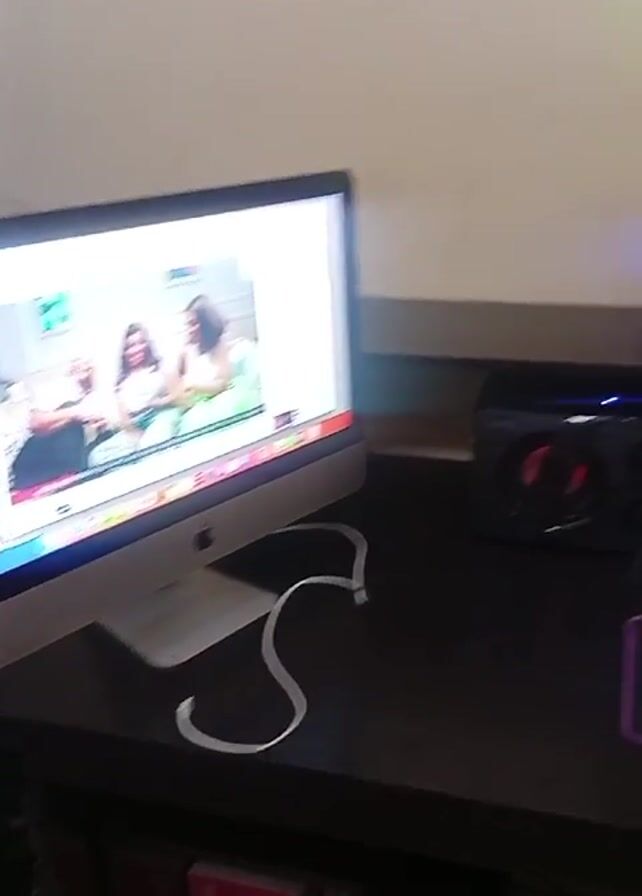 desk setup with two monitors. On the left, an Apple iMac displays a video of three women sitting on a couch. A white charging cable is near the base. To the right of the iMac, a sound system with visible red lighting is present. Above it, a larger Hisense monitor displays a colorful, abstract background. A white keyboard and black mouse sit on a purple mousepad. A set of keys is next to the mouse. In the lower shelf of the desk, a pink box and a brown paper bag are visible. Water bottles and a mug are on the right side of the desk. A rolling office chair is visible at the end of the table.