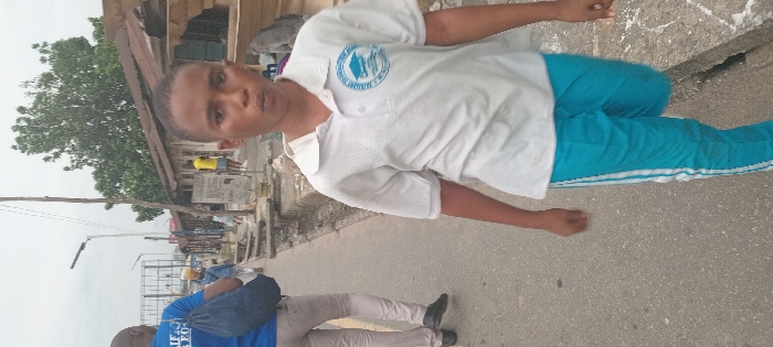 A person in a white shirt with a logo and blue sweatpants stands on a paved road. Another person in a blue shirt and khaki pants is visible in the background. A building with a corrugated metal roof and trees is also in the background. The sky is overcast.
