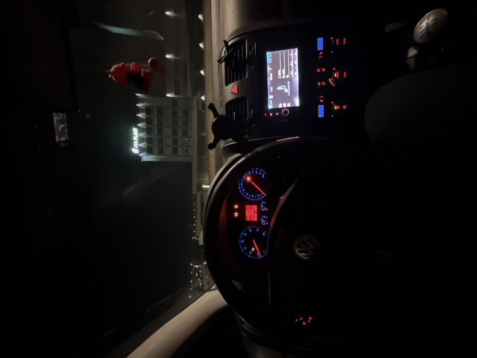 The image depicts a nighttime scene from the interior of a parked vehicle, specifically a Volkswagen, looking forward through the windshield