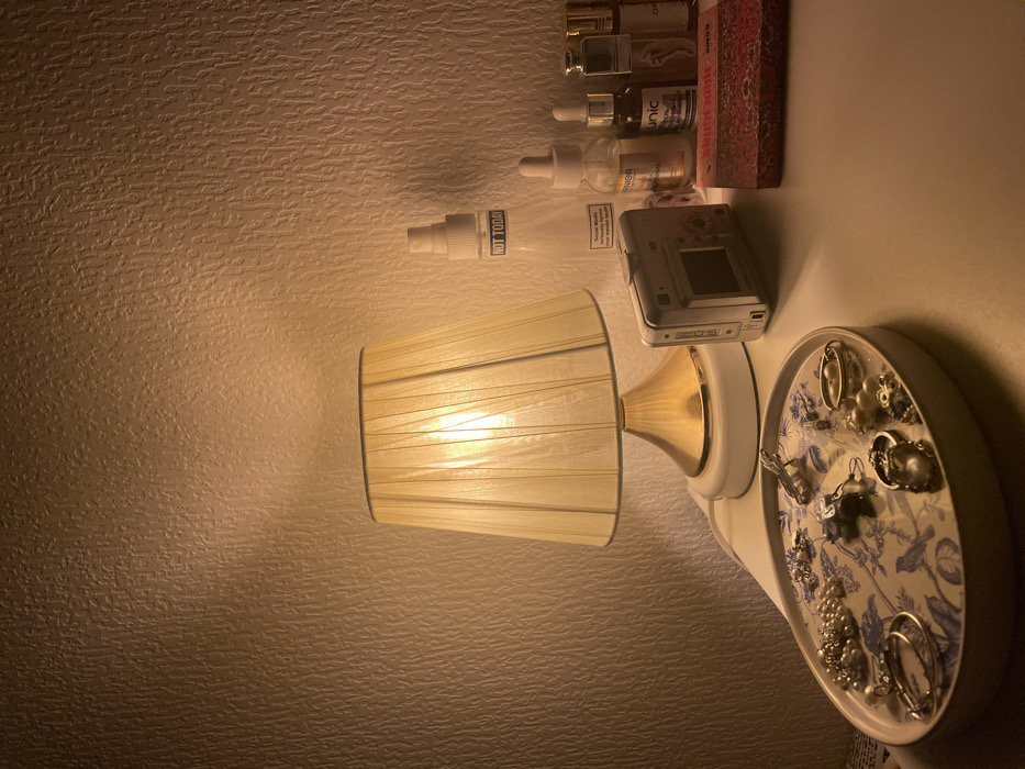 The image depicts an indoor scene, purportedly located in Saint Petersburg, Russia, showing a domestic or hotel room setting. Specific identifying landmarks for the city are not visible. The scene focuses on a tabletop surface against a textured wall, illuminated by a warm, artificial light source. The wall is covered in light-colored wallpaper with a subtle vertical, undulating pattern. On the tabletop, a cream-colored table lamp with a pleated fabric shade and a brass-colored base, resting on a white circular foot, is centrally positioned and illuminated. To the left of the lamp, an oval-shaped jewelry tray with a cream rim and a blue and white patterned base (depicting birds and foliage) holds various items of jewelry. These include multiple pearl clusters, silver-toned rings (one with a distinct frog design), hoop earrings, and assorted pendants or brooches. To the right of the lamp, a silver-colored compact digital camera lies on its side, with its unlit rear screen facing the viewer. Behind the camera and further to the right, a collection of bottles is arranged. This includes a clear plastic spray bottle with a white nozzle, bearing a label that reads "NOT TODAY" and a smaller label underneath stating "Social Media seriously harms mental health." Adjacent to it are several small glass dropper bottles, one partially labeled "GARNIER," another with "Unic" visible. Two slender, metallic or glass perfume-style bottles are also present. A rectangular, reddish-brown object, appearing to be a book or box with Cyrillic text, lies flat on the surface to the right. No individuals are present in the scene, and no actions or interactions are depicted.